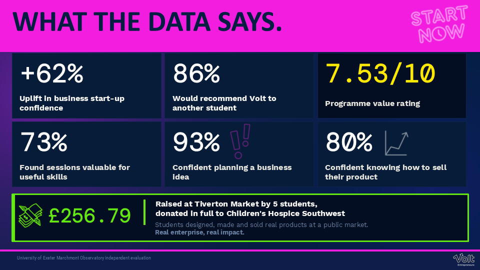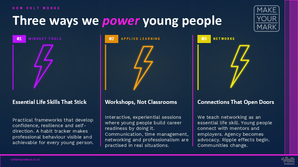 Volt delivers structured entrepreneurship training that builds professional skills, confidence, and progression for young people aged 14-18.